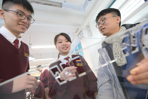 筲箕灣東官立中學學生到STEM教育中心上課,利用鐳射切割機切割膠片,制作益智玩具孔明鎖。
