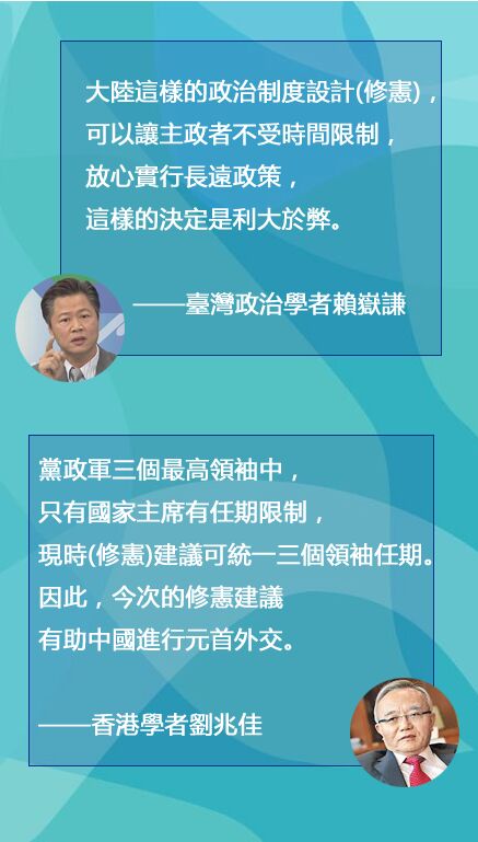 鄭耀棠又指,國家黨政軍架構中,軍委主席及中共總書記沒有任期限制,因此統一將國家主席修訂作沒有限期也是合理。