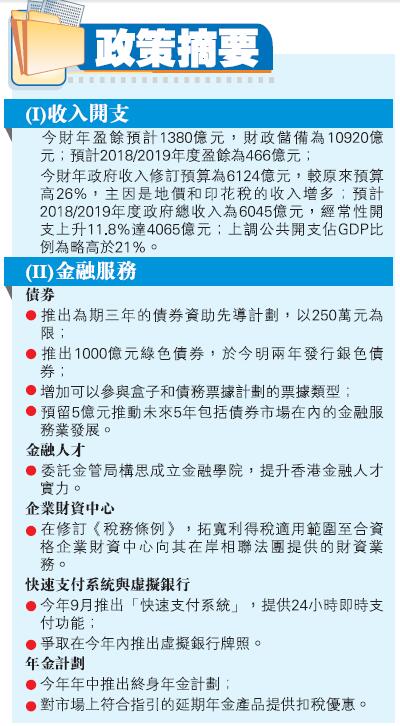值得一提的,還有政府推動綠色金融與綠色債券。陳茂波表示,將推出上限為1000億元的綠色債券發行計劃,集資所得將撥入基本工程儲備基金,為政府的綠色工務項目提供資金。香港品質保證局已於上月推出綠色金融認證計劃,為有意發行綠色債券的企業提供第三方認證服務,會設立綠色債券資助計劃,向合資格的綠色債券發行機構提供資助。