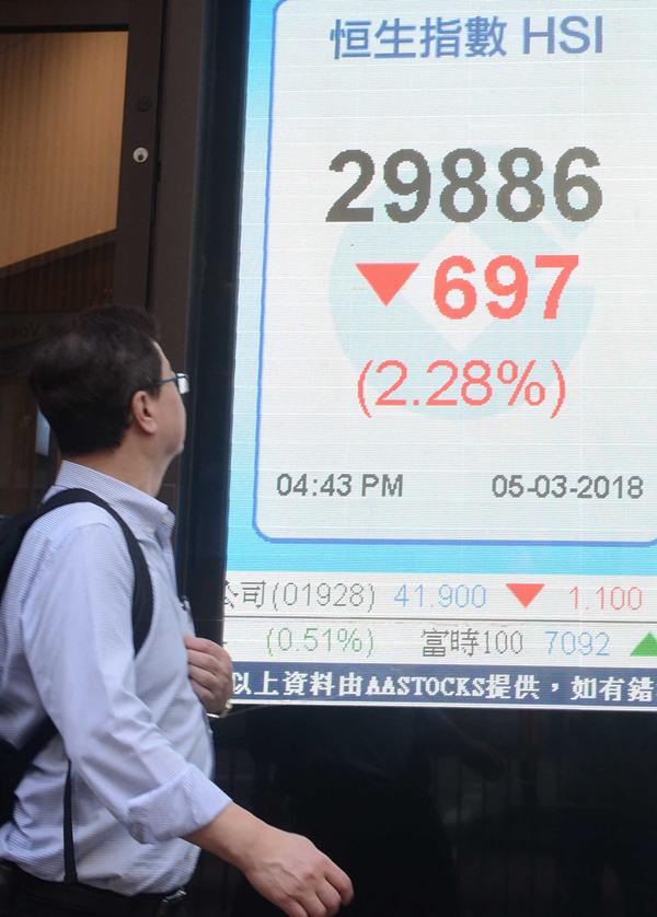 外圍政經環境動蕩,「兩會」維穩憧憬未能為大市降溫。由美國引發全球貿易戰憂慮尚未平息,接踵而來的意大利國會大選結果,亦將對意大利和歐元區的政局穩定、經濟發展構成威脅。在政局未明朗下,意大利10年期國債息上漲5個基點,至2.02%。歐元兌美元持續受壓,刷新日內低位,報1.2268。
