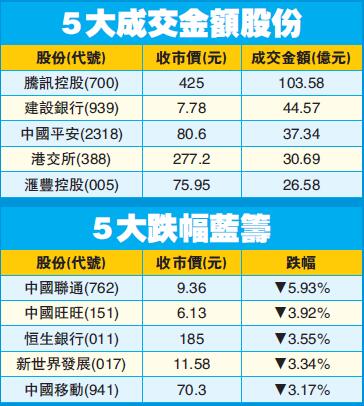 恒指昨日為今年第二次跌穿100天線,全日成交縮至1184億元。重磅股全線下挫,騰訊(700)以全日低位425元收市,跌2.5%,已拖低恒指77點。4大內銀股以建設銀行(939)跌2.7%最傷,其餘3行跌1.4%至2.5%。內險股亦捱沽,中國平安(2318)跌2.5%;新華保險(1336)跌3.3%。內地再提推動電信運營商提速降費,移動網絡流量資費年內至少降低30%。中國聯通(762)急挫5.9%;中移動(941)跌3.2%險守70元,是表現最差藍籌。