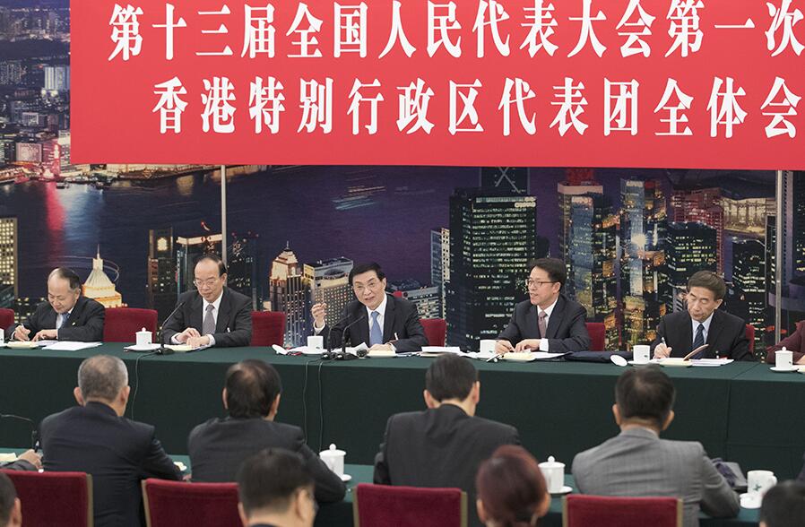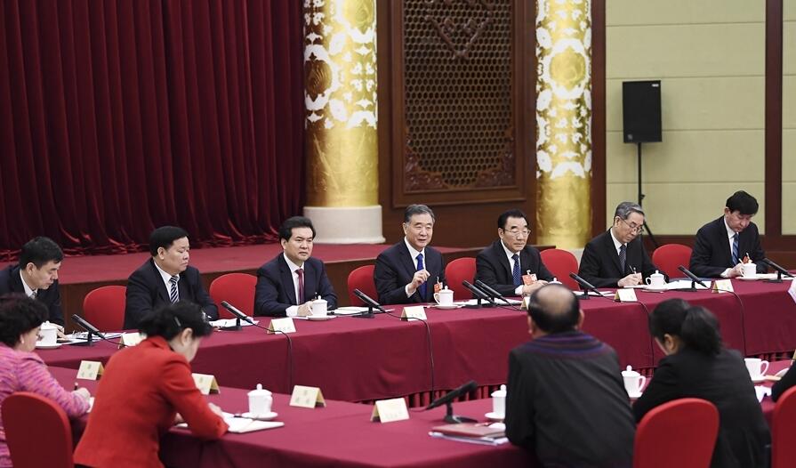 3月6日,中共中央政治局常委、中央书记处书记王沪宁参加十三届全国人大一次会议香港代表团的审议。 新华社记者王晔摄