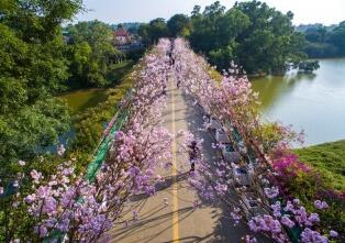 据悉,观澜湖生态体育园打造的“樱花节”引进了上千株樱花,打造了美丽的樱花大道、樱花海洋等主题景点。另外还有数万株荷兰郁金香、上万把油纸伞搭配樱花场景,连绵起伏,使游人徜徉在缤纷绚丽的花海。