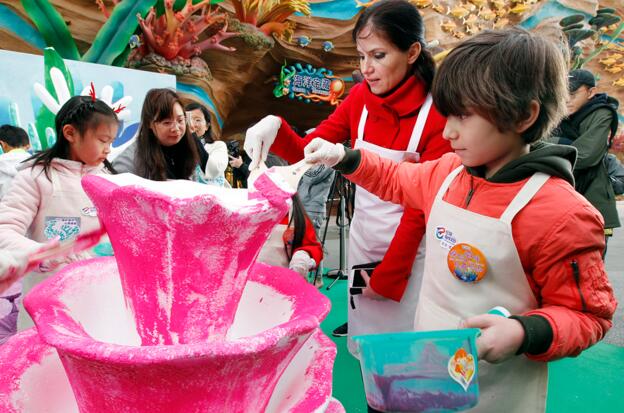 爱心妈妈携小朋友为巨型白色珊瑚雕塑填色。