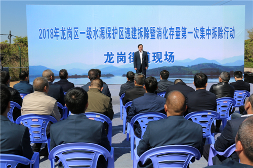 【香港商报网讯】记者朱开芝、通讯员曾良、涂斌、宋伟冬报道:日前,深圳市龙岗区开展了2018年一级水源保护区违建拆除暨消化存量第一次集中拆除行动,区长戴斌、副区长高旭敏前往主会场——龙岗街道五联社区蕉湖村,参加了当天的集中拆除行动,随着戴斌一声令下,2018年龙岗区一级水源保护区违建拆除暨消化存量第一次集中拆除行动开始。龙岗街道清林径拆除现场待命的四台大型炮机马力全开,开始对一级水源保护区违建进行拆除,随后,戴斌、旭敏对清林径一级水源保护区拆除现场进行了督导检查。