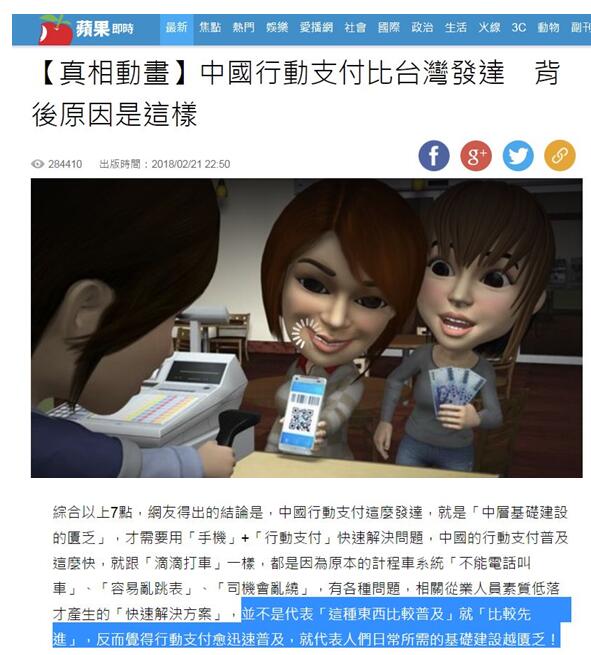 而《苹果日报》几周前的一篇抹黑大陆“移动支付”的文章,更是做出了“大陆的移动支付越发达,越说明大陆基础建设薄弱”这种荒诞的结论。而其理由则是,因为大陆基础建设太差,所以才要靠移动支付去解决别的国家没有的问题。