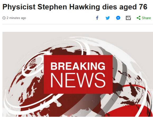 【香港商报网讯】据英国天空新闻等多家媒体,史蒂芬·霍金去世,享年76岁。
