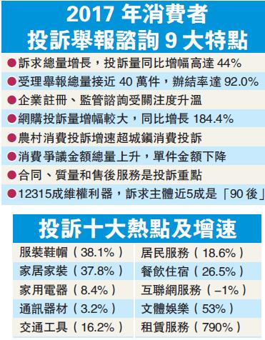 【香港商報网訊】在國際消費者權益日前夕,國家工商局發布最新數據顯示,2017年共受理消費者投訴240.04萬件,同比增長44.0%,其中,網購類投訴量同比增長184.4%,租賃服務類投訴是去年同期的8.9倍。