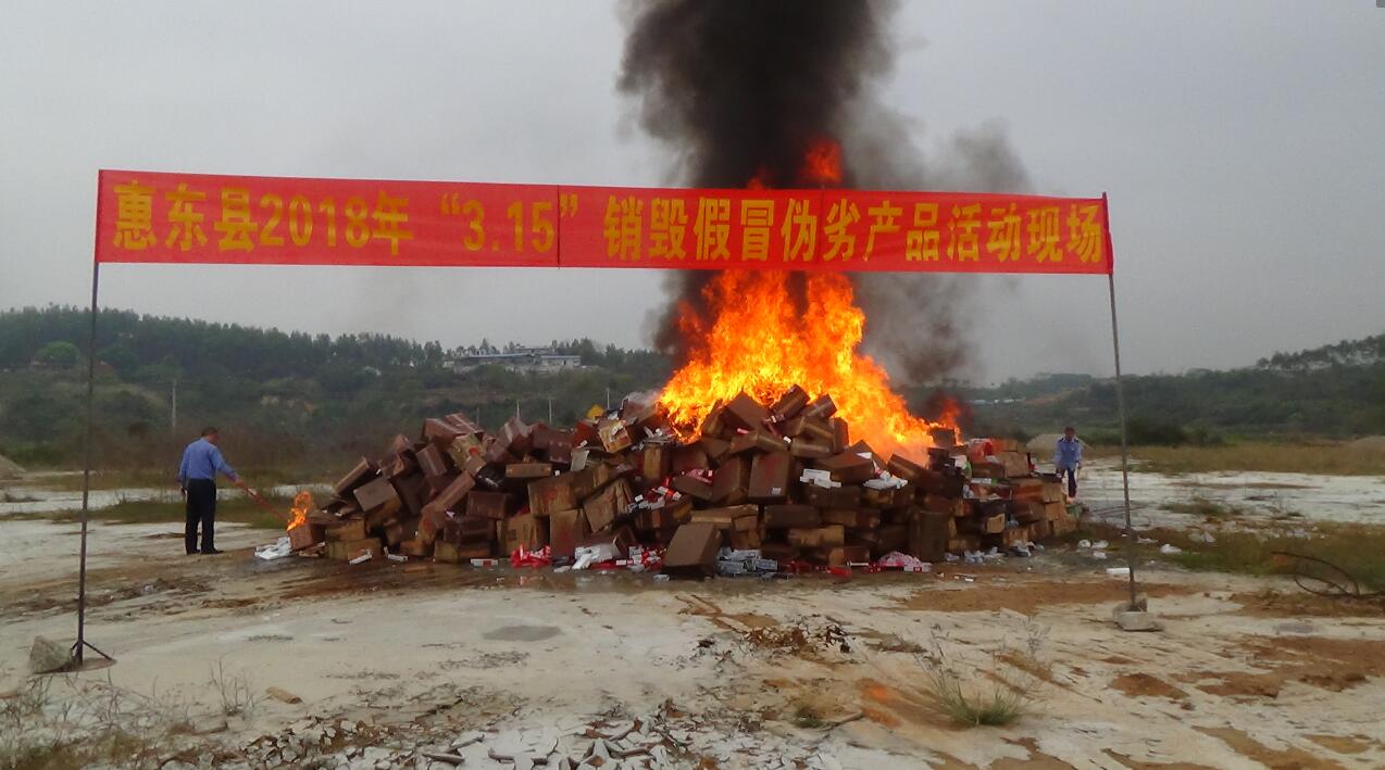 另悉,3月15日当天,惠东县消委会组织县打假办、县市场监管局、烟草专卖局、公安局等相关部门和部分企业等在全县设立5个分会场开展了“3.15”国际消费者权益日暨“12331”食品药品投诉举报现场咨询活动,共接待群众6000余人,发放宣传资料合计12000余份。开展了惠东县2018年“3.15”销毁假冒伪劣产品活动,集中销毁了一批假冒伪劣的农资、烟、酒、日用品、食品、药品等共12个大类86个品种,市场标值总计约506万元,有效避免不合格商品流入市场,震慑制售假冒伪劣商品的违法分子。