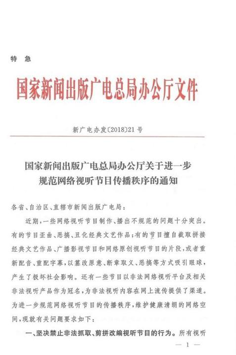 北京商报讯3月22日,国家新闻出版广电总局下发特急文件《关于进一步规范网络视听节目传播秩序的通知》(以下简称《通知》),针对当下部分网络视听节目非法抓取、剪拼改编的行为,以及各类节目接受冠名、赞助等方面进一步规范管理。