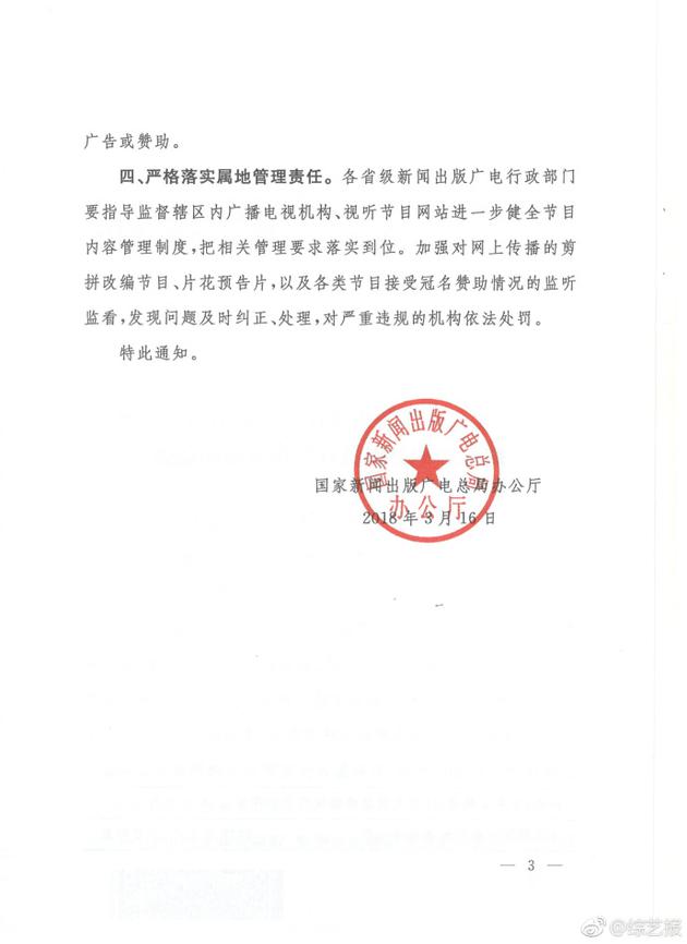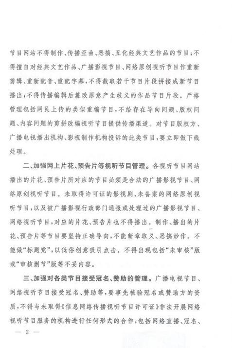 与此同时,《通知》还要求加强对各类节目接受冠名、赞助的管理。广播电视节目、网络视听节目接受冠名、赞助等,要事先核验冠名或赞助方的资质,不得与未取得《信息网络传播视听节目许可证》非法开展网络视听节目服务的机构进行任何形式的合作,包括网络直播、冠名、广告或赞助。