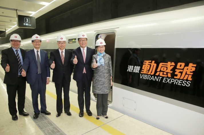 行政長官林鄭月娥於運輸及房屋局局長陳帆、港鐵主席馬時亨等人陪同下,昨由石崗列車停放處,乘坐「動感號」到西九站出席高鐵香港段項目主要工程竣工典禮。林鄭到達后,從預設的內地口岸區步行到香港口岸區,期間走過兩地政府的入境與海關等口岸設施,沿途聽取簡介。