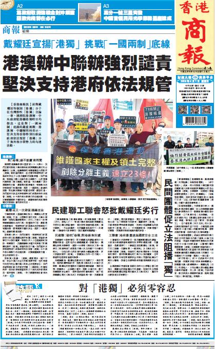 【香港商報网訊】針對戴耀廷等個別「港獨」分子在台灣鼓吹「港獨」言論一事,國務院港澳辦、中央政府駐港聯絡辦昨日均指出,這是對「一國兩制」底線的嚴重挑戰。港澳辦、中聯辦同時表示,堅決支持香港特別行政區政府依法規管「港獨」分子與外部分裂勢力的勾連活動。