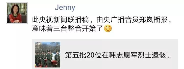 央廣《新聞和報紙摘要》播音員鄭嵐,曾多次擔任重大會議的現場稿件宣讀工作。3月29日《新聞聯播》中播出的《第五批20位在韓志願軍烈士遺骸在沈陽安葬》的新聞,聲音就是出自鄭嵐,她也成為首位獻聲《新聞聯播》的央廣播音員。