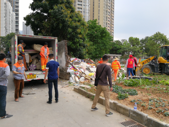 活动现场,党员义工及在场工作人员发扬不怕脏不怕累的奉献精神,配合铲车合力搬运大件垃圾,逐步清理、分工明确、有条不紊。行动中出动金刚自卸车1辆、货车3辆、推土机一辆、垃圾压缩车1辆,经过5个小时辛苦奋战,共清除4车共50方大件垃圾,20车共30余吨混合垃圾。
