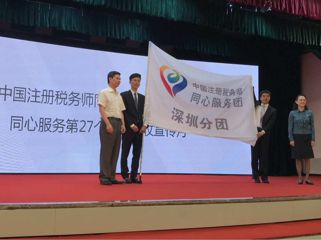 深圳市地税局副局长杨龙、深圳注册税务师协会会长桂乃希为深圳税务师志愿者组成的“中国注册税务师同心服务团深圳分团”授旗并颁发牌匾。