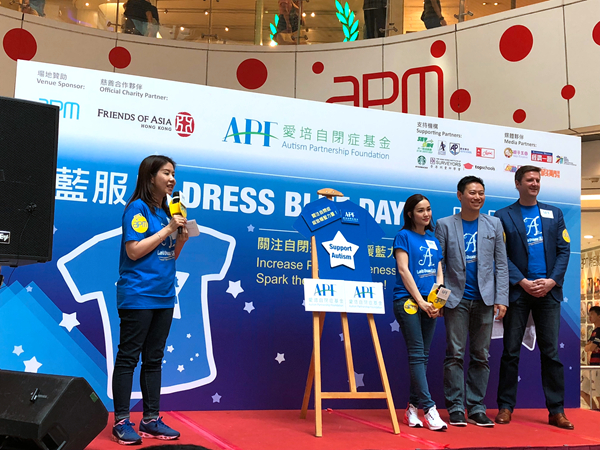 愛培自閉症基金於APM舉辦「藍服日」,呼吁大家穿上藍色衣服,以響應聯合國「世界關注自閉症日」呼吁。基金會主席Toby Mountjoy、勞工及福利局副局長徐英偉及著名藝人謝安琪出席擔任活動主禮嘉賓。Toby Mountjoy表示,基金於10多年前成立,透過家庭訓練及導師協助等,為過百個家庭提供協助,日后希望做更多工作,甚至由幼稚園方面入手。