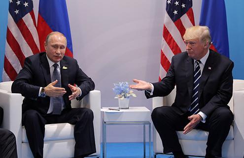 资料图:当地时间2017年7月7日,德国汉堡,美国总统特朗普与俄罗斯总统普京会晤。