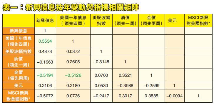 可參考回歸分析。先觀察這六個指標之間的相關性。表一可見,綜觀而言,新興債息按年變動與四周前的美國長息按年變動相關度最高,隨後便是一周前的金價按年變動。不過兩者相關度極高,為免數據問題,因此不把金價納入回歸分析。同樣,由於一周前的油價按年增長與美元按年增長相關度極高,因此不把美元按年增長納入回歸分析。