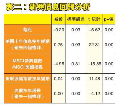 將四周前的美國長息按年變動、MSCI新興對美國指數、美股波幅指數按年變動及一周前油價按年增長與新興債息按年變動作回歸分析,得出表二。結果顯示,各指標的p值均極近0,可見這五指標足以解釋新興債息。從系數來看,MSCI新興對美國指數對新興債息的影響最大,隨後便是四周前的美國長息,可見這兩者主導新興債息去向。