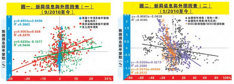 再看新興與美股相對表現及商品價格與新興債息關係。圖二顯示,MSCI新興指數相對MSCI美國指數、油價及金價按年增長,均與新興債息按年變動呈反比關係;其中油價升幅領先約一周,而金價領先約兩周。簡單而言,當主要風險資產回落,或有避險屬性的商品表現向好時,均利好新興債市。初步顯示這六個指標與新興債息表現有關,但有因果關係嗎?