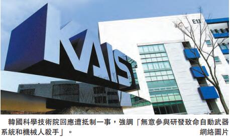 由澳洲新南威爾士大學AI教授沃爾什發起,美國和日本等30個國家和地區的研究人員當日簽署了一封公開信,敦促韓國科學技術院停止AI武器研發。公開信稱,擁有AI的機械人武器「可能使戰爭惡化並為恐怖分子所利用,一旦開發出來將無法挽回」。這些研究人員還表示,將拒絕訪問韓國科學技術院、接待對方訪客或與對方合作研究項目,直至這所韓國頂尖大學承諾放棄研發缺少「有效人工控制」的武器。