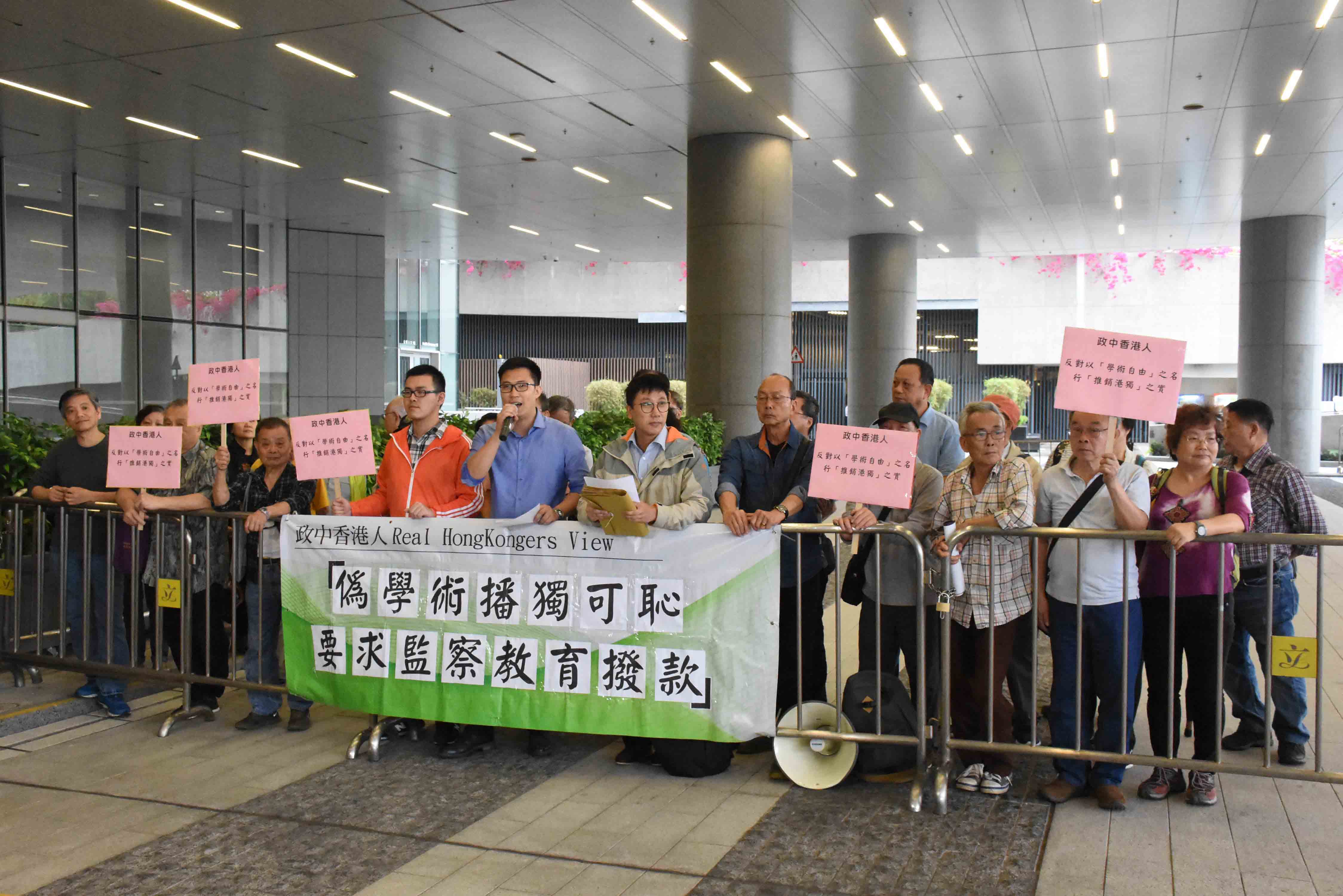 「政中香港人」一行20人,带同印有「反对以学术自由之名,行推销『港独』之实」及「伪学术『播独』可耻,要求监察教育拨款」的纸牌与横额,就香港大学法律系副教授及「占领行动」发起人戴耀廷散播「港独」一事,前往立法会示威区示威。
