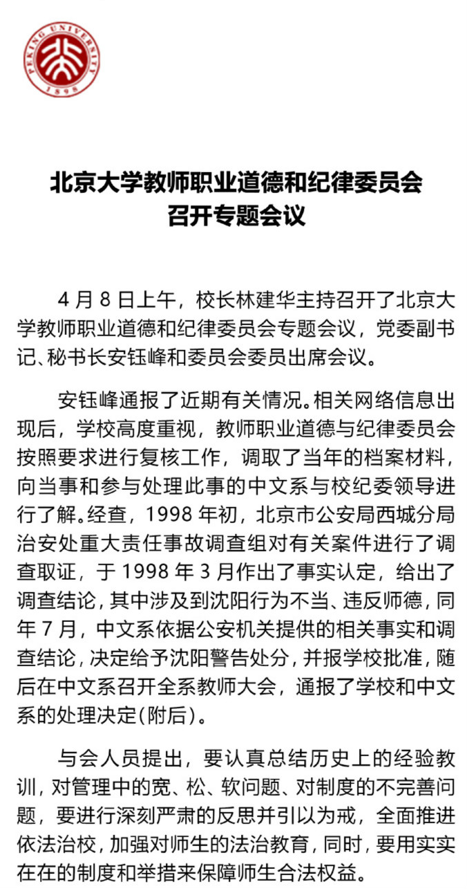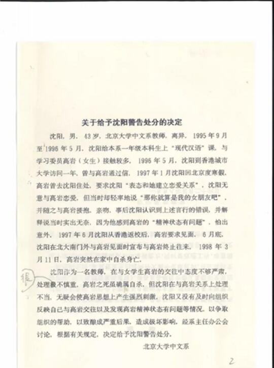 今天中午,北京大学发布通报,公开了1998年校方、中文系的两份处分决定。《处分决定》的措辞是:1997年1月沈阳回北京度假,高岩去沈阳住处,要沈阳“表态和她建立恋爱关系”,沈阳无意与高岩恋爱,但当时却回答说“那你就算是我的女朋友吧”,并与高岩搂抱、亲吻。