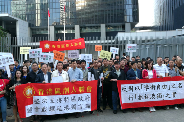 香港區潮人聯會昨逾百人帶同標語及口號,譴責戴耀廷於台灣發表有關香港可成為「獨立國家」的謬論,對其言行表示極度憤慨。他們又支持特區政府譴責戴耀廷言論的聲明。