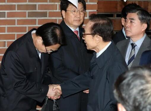 李明博被移送至拘留所前,与亲信道别