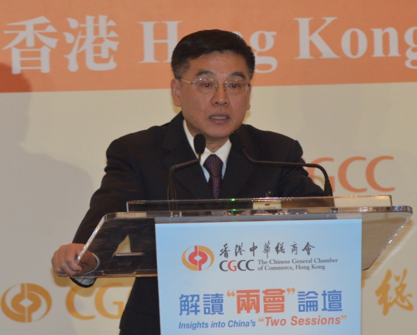 為深入了解全國「兩會」的重要政策和國家未來發展方向,香港中華總商會昨舉辦「解讀『兩會』論壇」,邀請多名嘉賓出席,包括梁振英、中聯辦副主任譚鐵牛、外交部駐港特派員公署副特派員楊義瑞,以及各國駐港領事及商務代表、本港工商社團領導和社會各界友好等近300人。