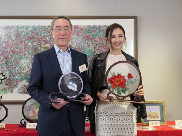 唐英年與嘉賓高海寧介紹江蘇藝術品。