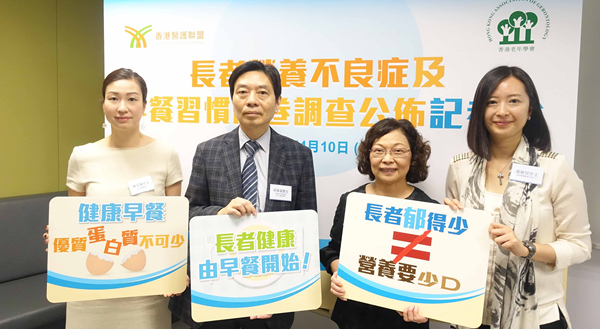 為了解本港長者進食早餐時的營養攝取情況,香港醫護聯盟早前成功訪問268名60歲以上長者,發現70%受訪者習慣在家進食早餐,在選擇早餐時僅16%會考慮營養因素。調查發現,70%長者偏重碳水化合物類早餐(如麵包類、早餐穀類、米飯及粥類、麵類等),另有多達36%長者認為「因新陳代謝速度較慢,進食早餐時不用補充太多蛋白質及各類營養」。