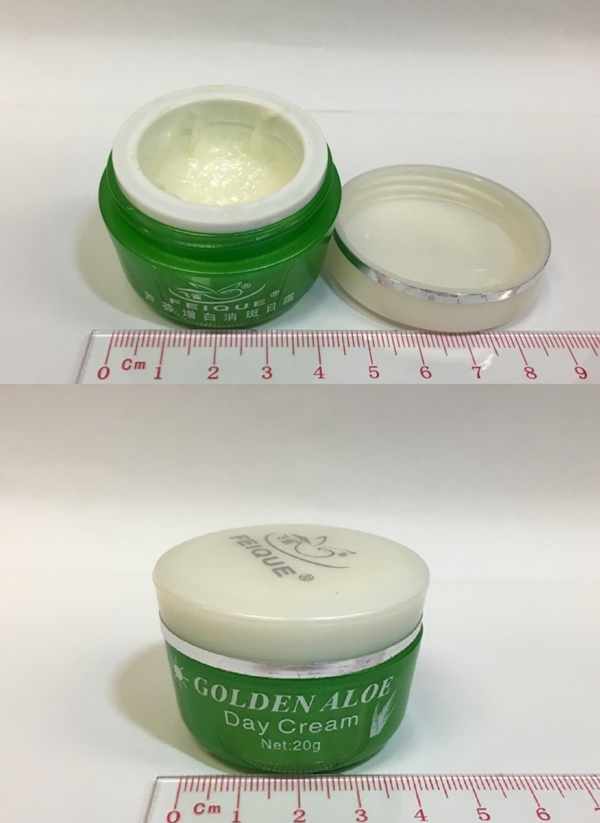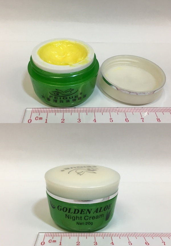 水銀超標的美白晚霜(上圖)及美白日霜(下圖)。
