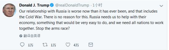 就在扬言导弹飞向叙利亚仅过40分钟后,特朗普又发推称,“当前美俄关系比包括冷战在内的以往任何时候都更差。这没有道理。俄罗斯需要我们帮助他们提振经济,这是小菜一碟,而我们需要所有国家共同合作。停止军备竞赛怎么样?”