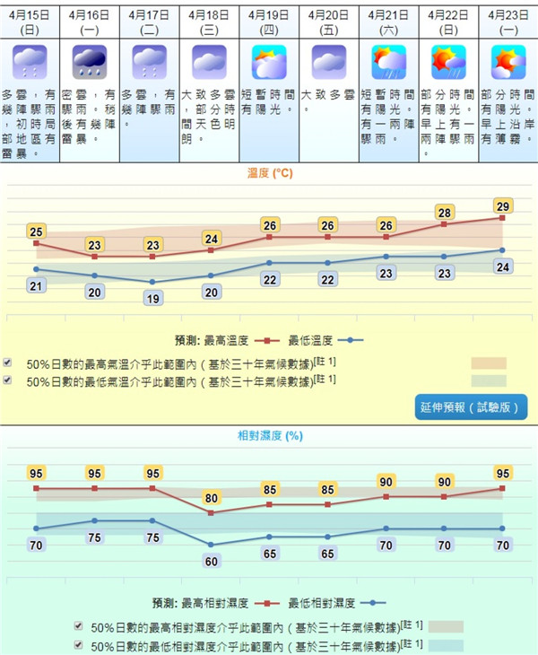 天文台又指,未來兩、三日將有驟雨及幾陣雷暴,下周二(17日)最低氣溫只有19度。隨著高空擾動遠離,下周中期廣東沿岸天色較為明朗,屆時氣溫將逐步回升。