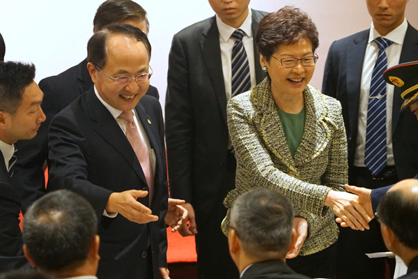 昨日「全民國家安全教育日香港研討會」上,行政長官林鄭月娥、中聯辦主任王志民與嘉賓握手致意。中新社