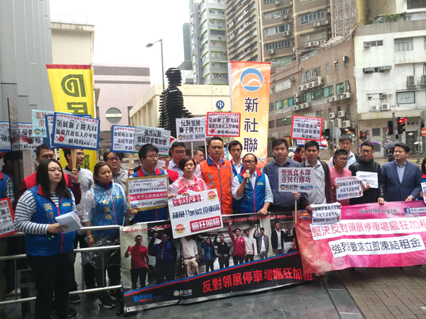 民建聯、新社聯偕一批不滿領展停車場加價的車主,發起汽車慢駛游行,要求凍結租金。