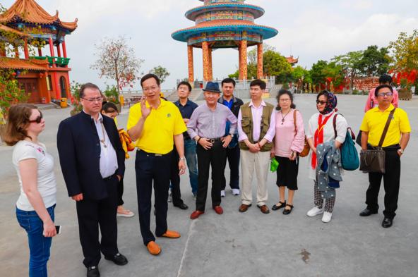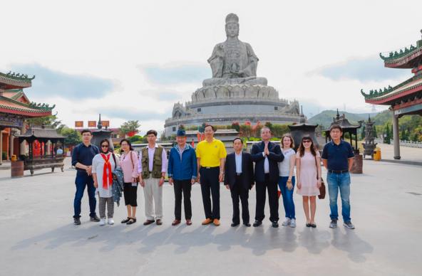 位于东莞市樟木头镇的广东观音山国家森林公园,群山环抱,素有“南天圣地、百粤秘境”美誉。四月的观音山,春意盎然,鸟语花香。“中外作家交流营”采风团一行乘坐观光车,沿着山路蜿蜒向上,直奔山顶广场。在观音广场,采风团瞻仰了世界最大花岗岩石雕观音圣像,有作家有感而发,观音圣像在蓝天白云映衬下和四面青山簇拥中,显得尤为神圣、庄严而又不失祥和、慈悲。特别听到观音山景区相关负责人讲解了观音圣像的历史和观音文化后,中外作家们被观音山的观音文化深深触动,纷纷双手合十参拜观音圣像。