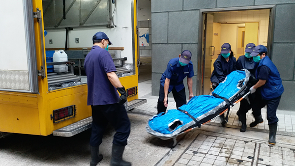 仵工將死者遺體舁送殮房。