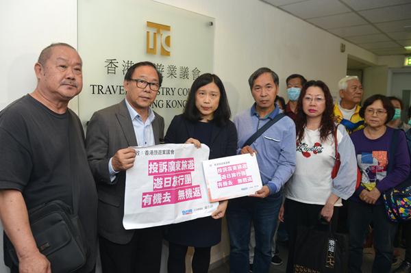 梁志祥昨日陪同10名苦主到旅游業議會遞信,要求旅行社賠償。梁表示,現時旅游保險條款明顯不足,包括若航班因機組問題停飛,投保人便不獲賠償,旅游業賠償基金亦不包括交通事故引致的損失,認為政府有必要檢討相關條例。