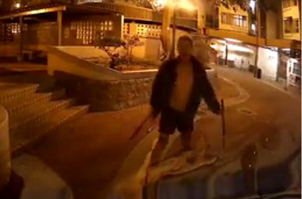 在長約1分鐘的片段中,顯示事發時間為24日晚9時58分,該名中年男子蓄金色短髮、穿黑色外套、短褲及拖鞋,多次在上址對開的公園來回,並揮舞手上的開山刀及棍狀物體,不時情緒激動大叫。