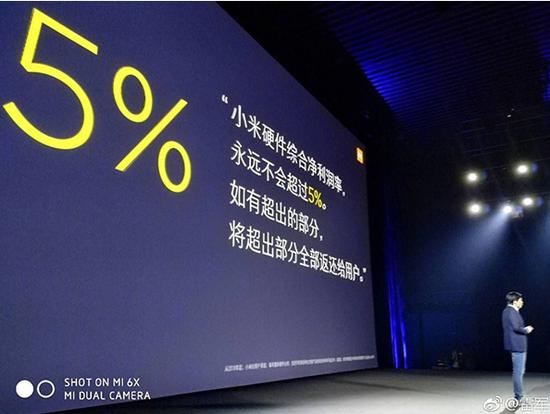 刚刚在武汉大学举行的小米6X发布会上,我们向所有用户承诺,小米整体硬件业务的综合净利率,永远不会超过5%。