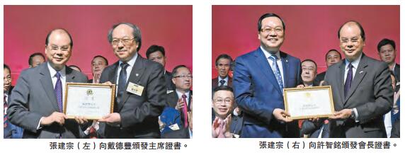 【香港商報网訊】記者霄虹報道:香港廣東外商公會、廣東省工商聯(總商會)2018新春聯歡晚會、慶祝廣東外商公會成立30周年暨第八屆理事會就職典禮晚會,日前在香港會展中心大會堂隆重舉行,戴德豐連任主席、許智銘連任會長。全國政協副主席董建華,署理行政長官張建宗,中聯辦副主任何靖,廣東省政協原副主席、孫中山基金會理事長湯炳權,外交部駐港副特派員趙建凱,駐港部隊副政治委員、少將陳亞丁等擔任主禮嘉賓,與兩會首長,來自內地、香港及澳門的政商名流、友好600餘人聚首一堂,共同見證新屆理事會就職,場面盛大。