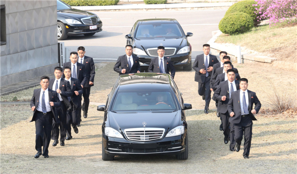 金正恩昨日上午結束與文在寅會談後乘車返回朝鮮,12名身材高大、理平頭、穿深色西裝的安保人員一路快跑跟隨,成為媒體焦點。當天下午,金正恩座駕進入植樹現場時,安保人員再度快跑護衛,引發大批媒體記者驚呼。