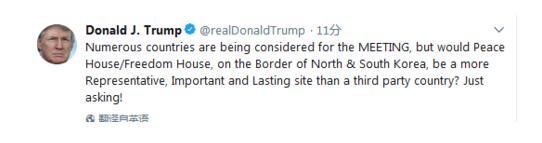 美国总统特朗普4月30日发推表示,正考虑在朝韩边境的“和平之家”与朝鲜领导人金正恩会面。据此前报道,当地时间周六(28日),美国总统特朗普表示他可能会在未来3至4周与朝鲜最高领导人金正恩会面。特朗普说,美朝首脑会面备选地点有“2个或3个”,不过他没有披露细节。此前他曾表示,正在考虑从5处地点中选出会面地,同时暂设3或4个会面日期。(海外网 孙蒙)