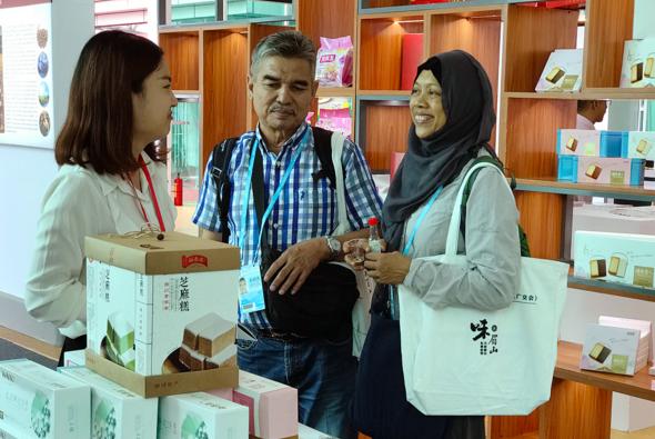 销售人员向国外采购商介绍眉山美味。