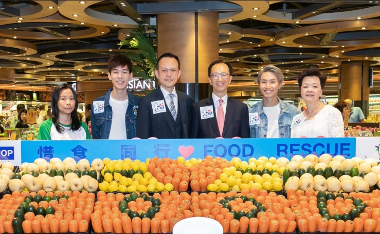 (右起)百佳惜食大使、著名歌手陈柏宇、惜食主席梁锦松、百佳超级市场董事总经理黄浩经、著名歌手林奕匡及食品盒供应商ClipFresh创办人汤吴笑娟任「全城傳愛齊捐食」启动礼嘉宾。