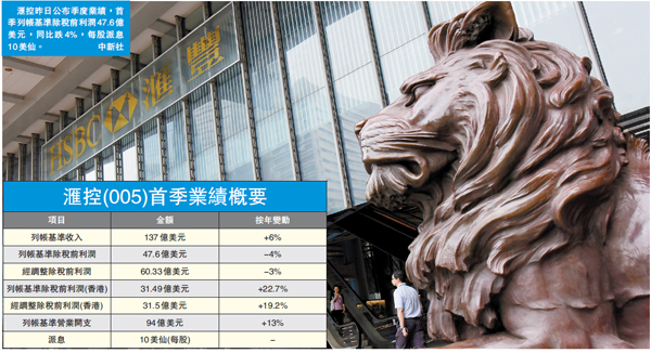【香港商報網訊】記者潘晶、實習記者仝薇報道:汇豐控股(005)昨日公布季度業績,截至今年3月底首季列帳基準除稅前利潤為47.6億美元,同比跌4%,派息為每股10美仙。其中主要原因是營業開支較去年同期上升了13%,從而拖累了業績。期內經調整除稅前利潤為60.33億美元,按年跌3%。汇控公布業績後,股價跌幅進一步擴大,全日跌3.54%或2.75元,收報74.95元。