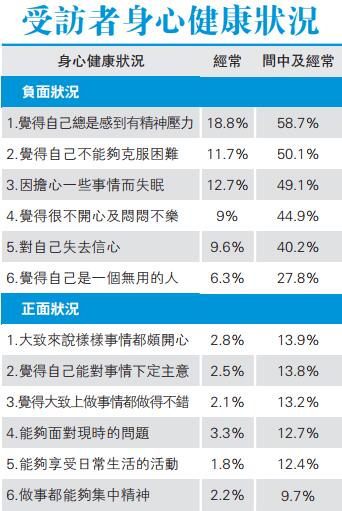 為探討港人的精神健康與生活習慣的現況及兩者的關係,浸信會愛羣社會服務處去年進行「社區人士身心健康狀況調查」,成功訪問2100名市民。調查透過「一般健康問卷」( General Health Questionnaire, GHQ-12(中文版))量度受訪者的精神健康狀況。受訪者以0(完全沒有)至3(經常)表達每題所述情況於過去一個月內出現的頻率。總分最高可得36分,得15分或以上可界定為受精神困擾,得分越高表示困擾情況越嚴重。